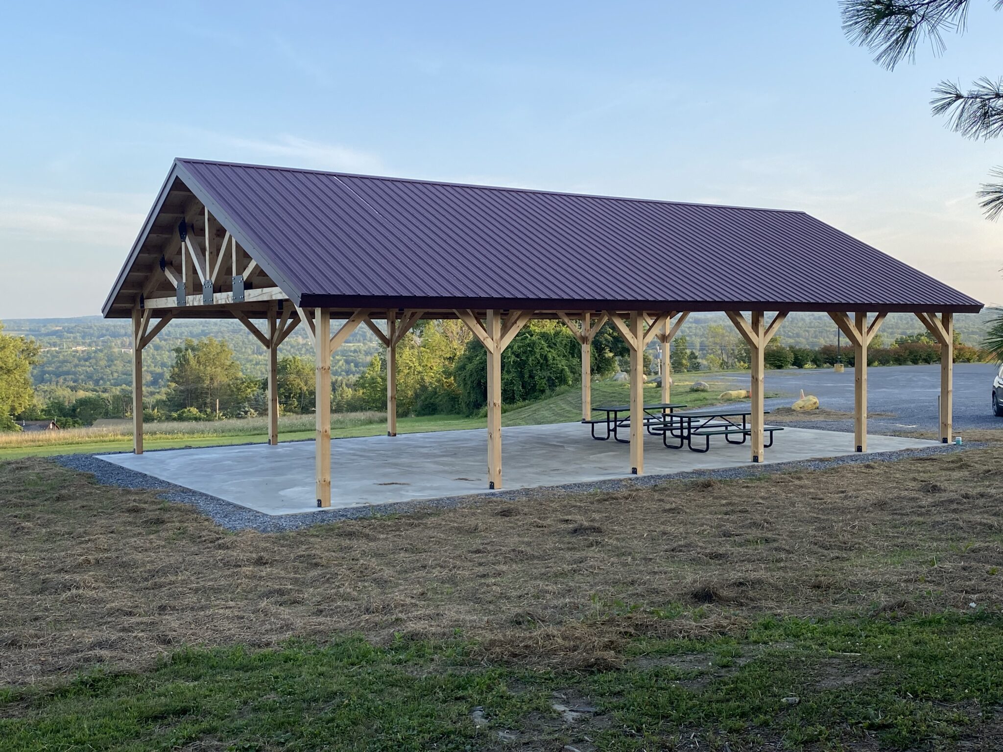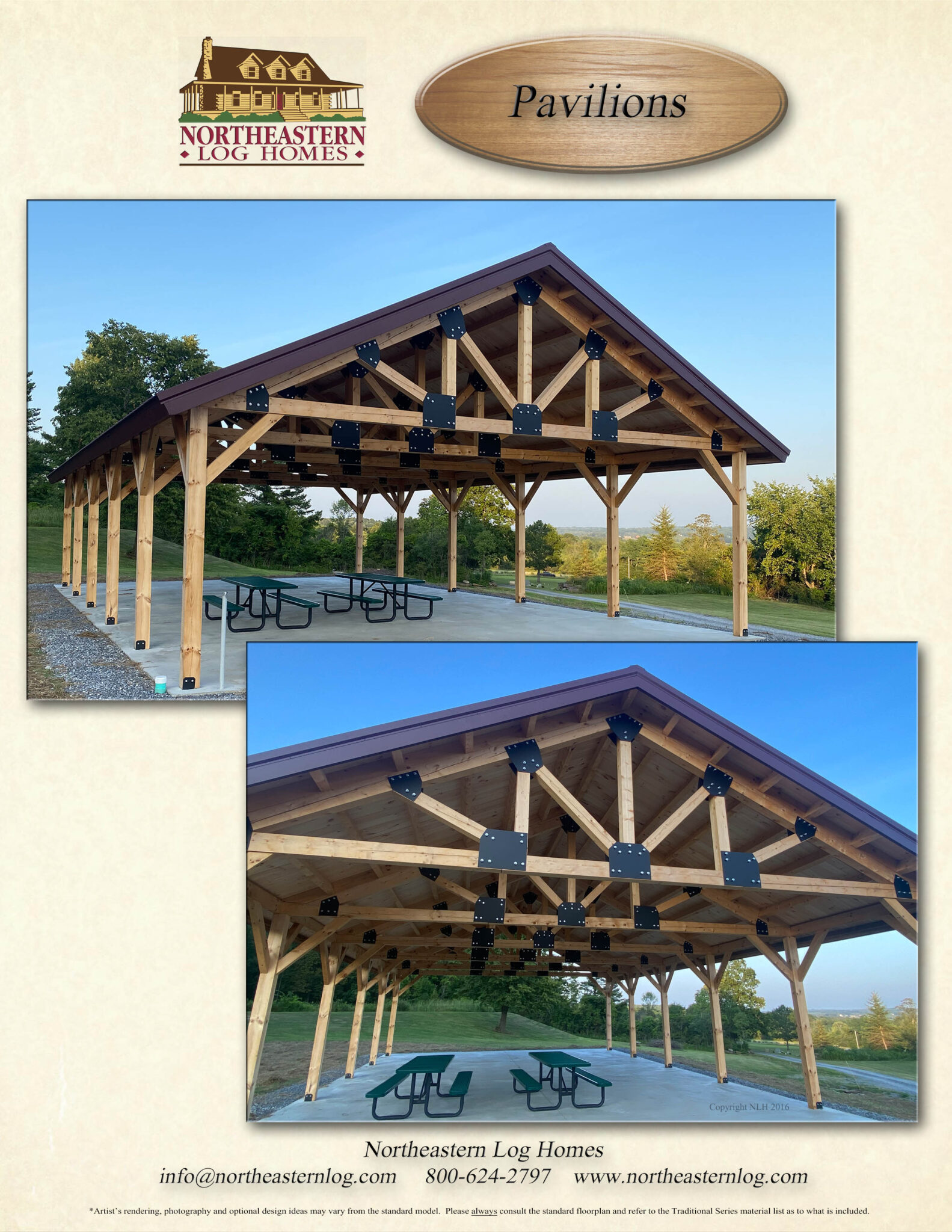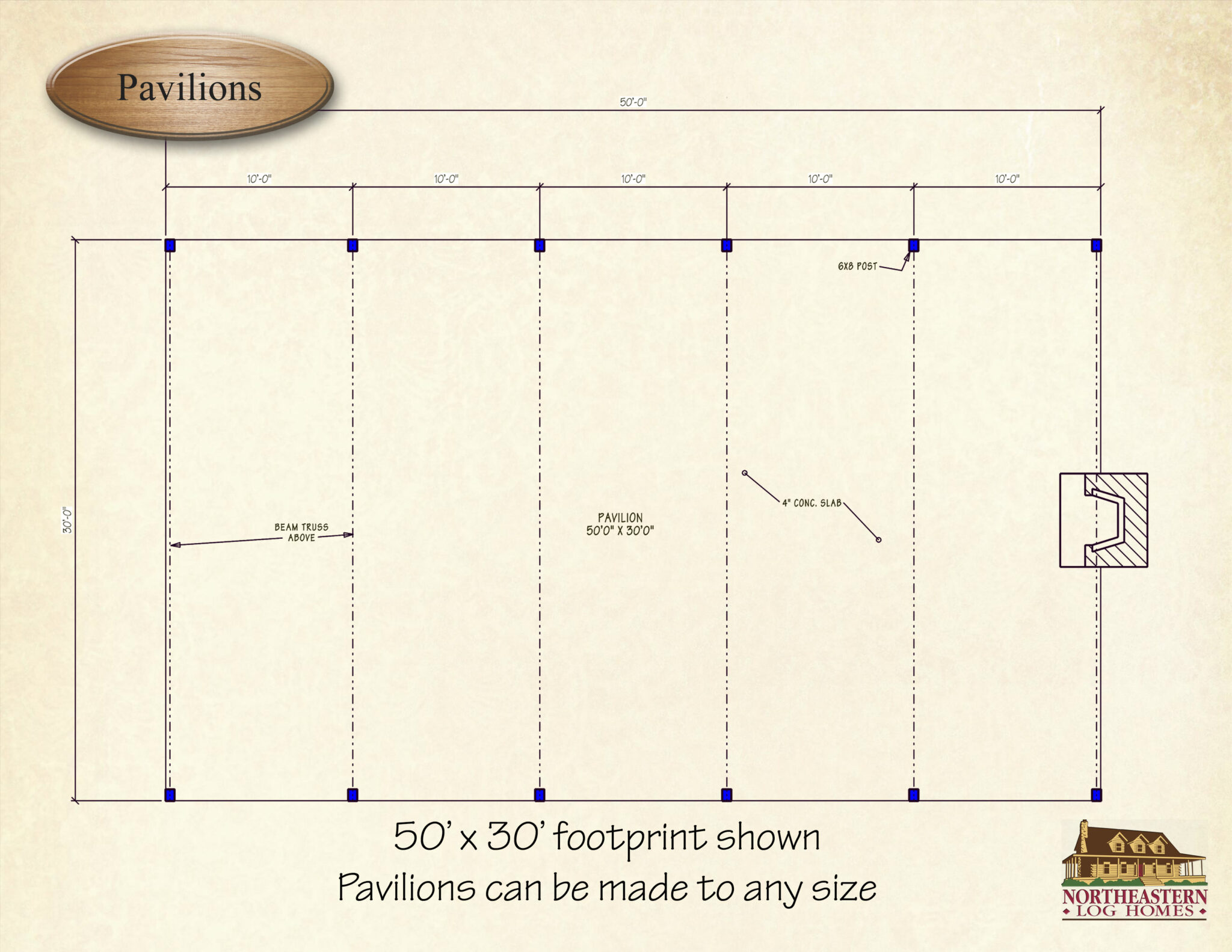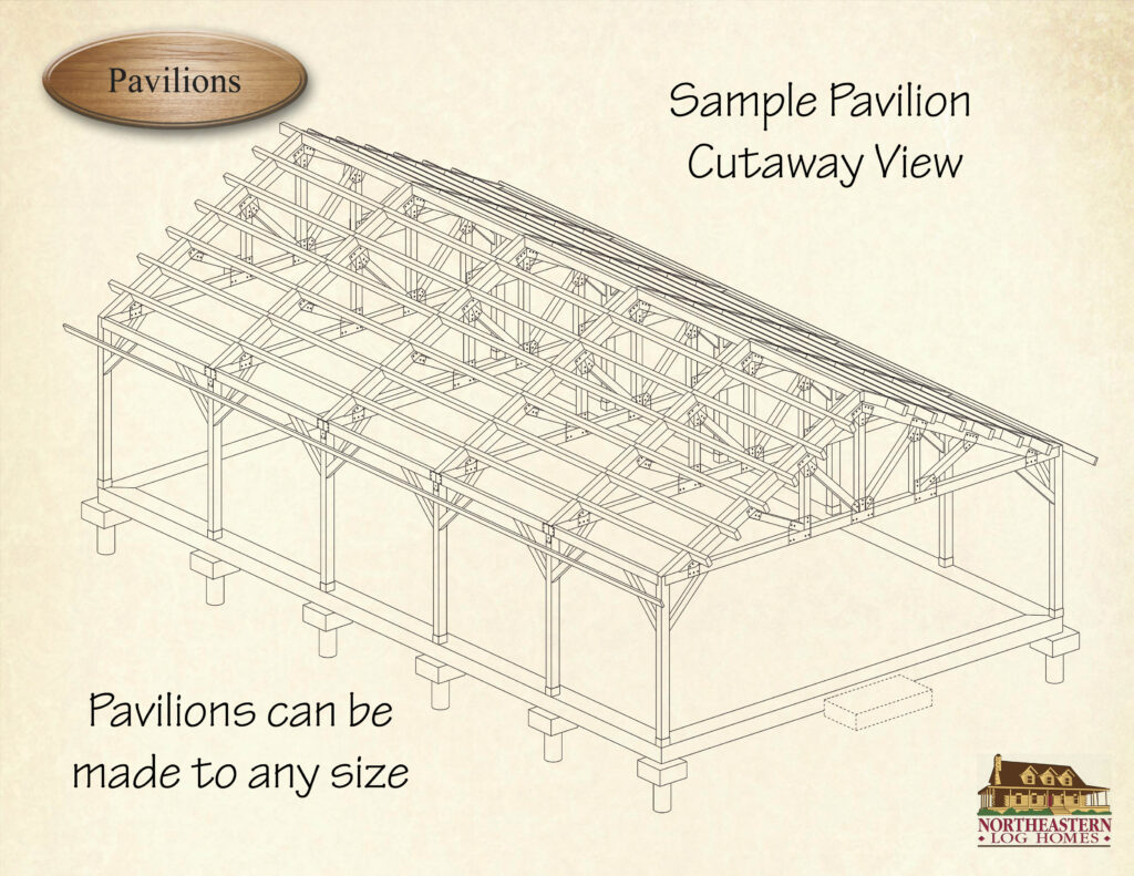 Northeastern Log Homes and Classic Post & Beam proudly feature pre-cut open-air pavilion material packages!  They can be customized to your size specifications–ideal for campgrounds, churches, outdoor activity areas.  The Pavilion shown here is 30′ x 50′.